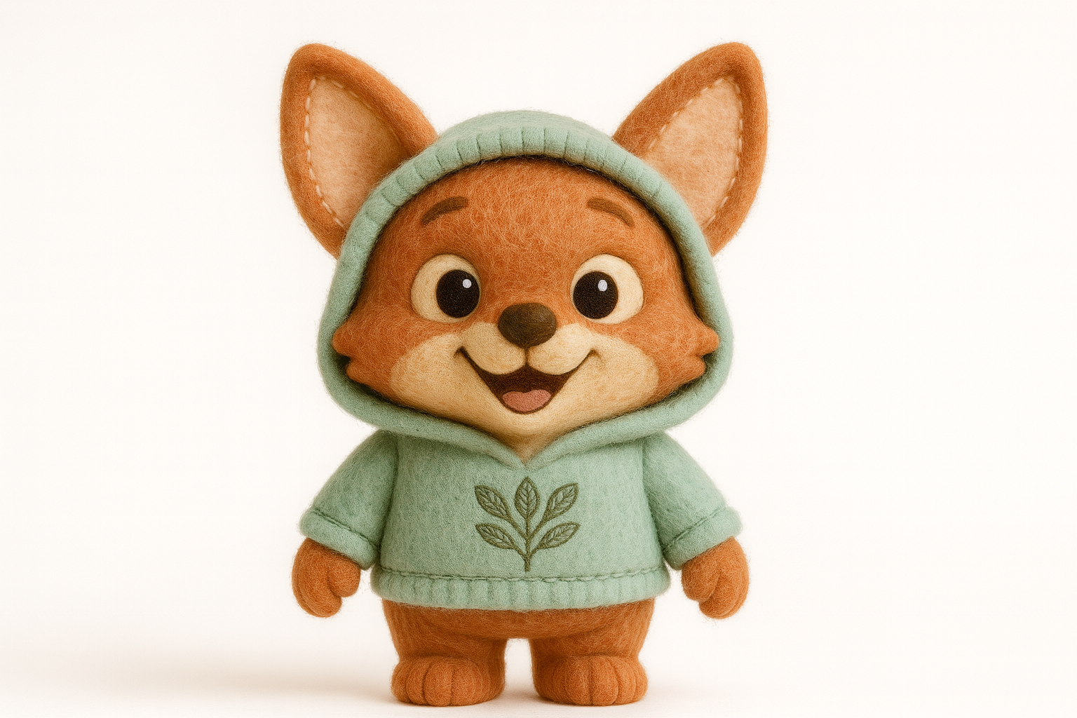 {species} with {main color} felt body, dressed in {custom outfit details –