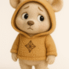 e.g., soft woolen hoodie with hand-embroidered symbol}, posed with a